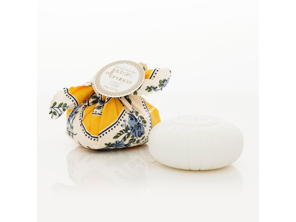 Jemné mydlo z limitovanej edície portugalskej značky Castelbel je ručne balené do textilného obrúsku - dokonalé spojenie tradície a luxusu. Mydlo má 100% rastlinný základ, sofistikovanú vôňu bieleho jazmínu.