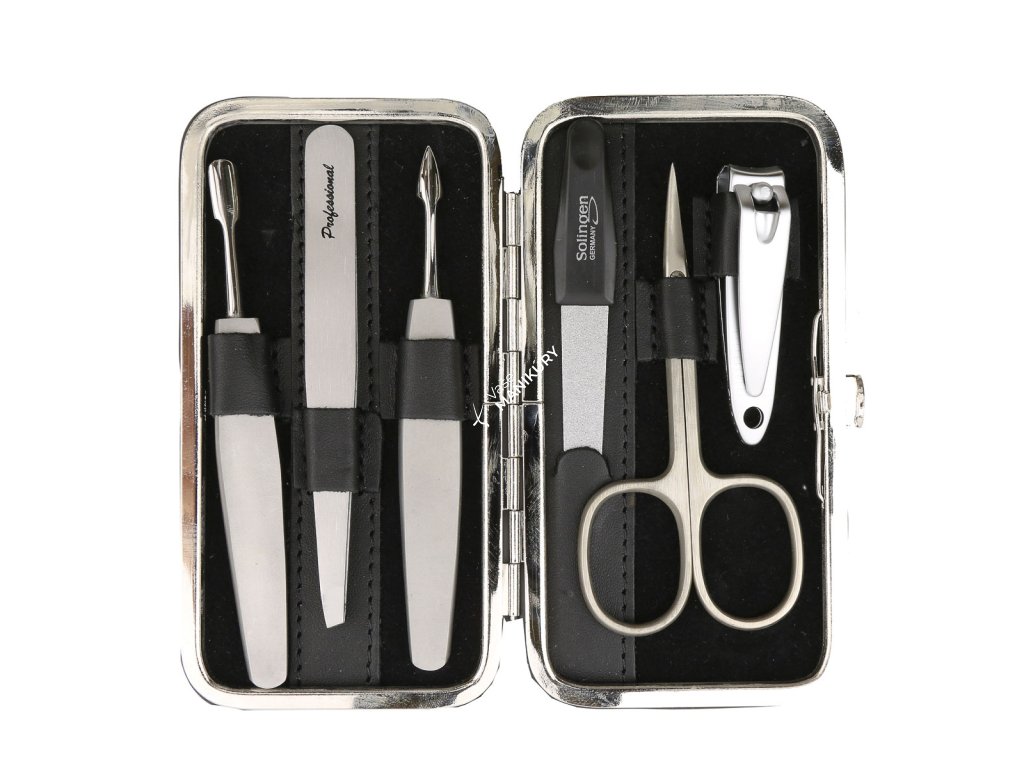 Cestovný kožený set na manikúru v čiernej farbe s kvalitnými nástrojmi.