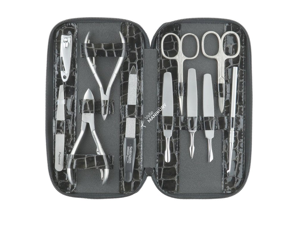Veľmi dobre vybavená sada na manikúru a pedikúru v koženom puzdre je vybavená nerezovými nástrojmi a nožnicami Solingen.