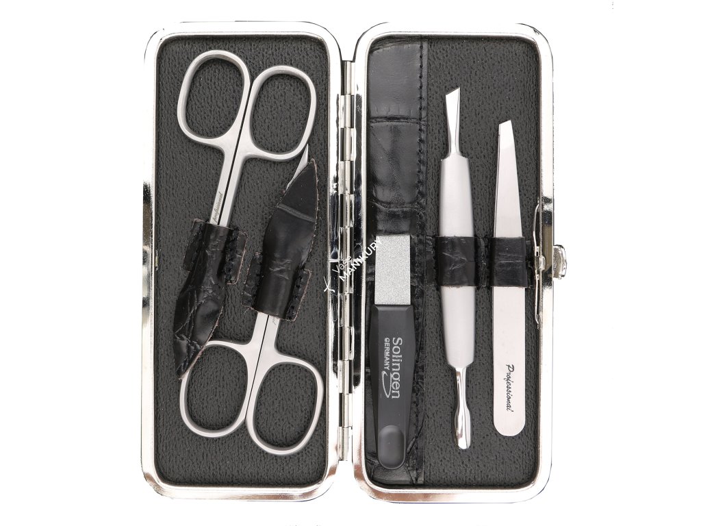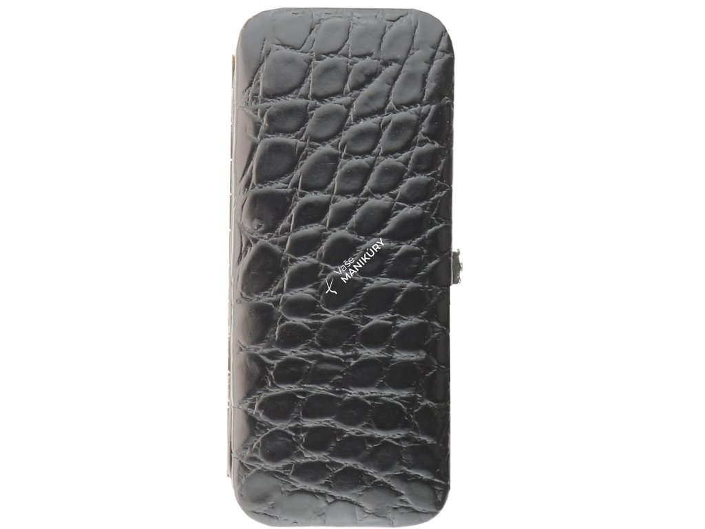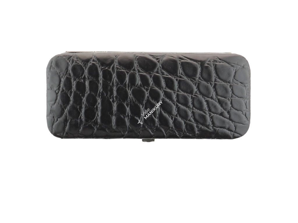 Čierna 5-dielna sada na manikúru pre ženy s kvalitnými nerezovými nástrojmi. Kožené puzdro s dizajnom krokodíla.
