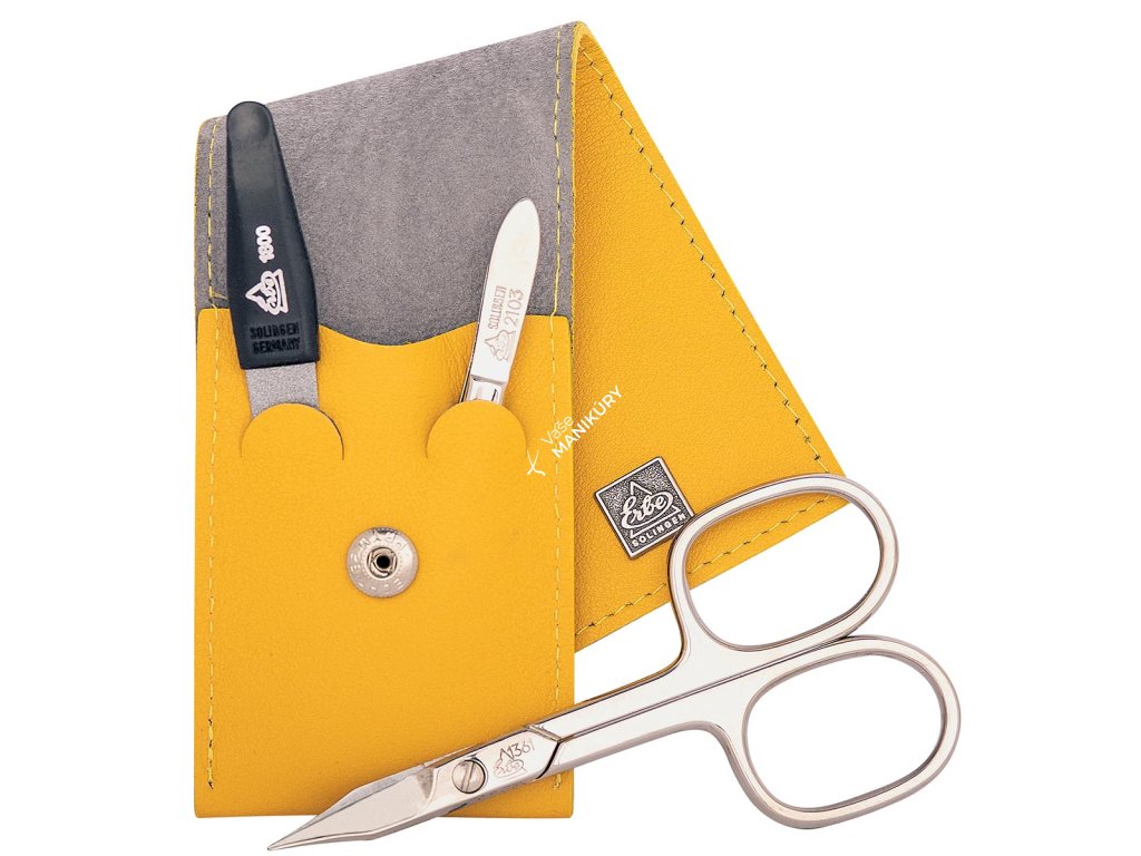 Puzdro je vyrobené z jemnej prírodnej hovädzej kože v žltej farbe s hladkou povrchovou úpravou. Puzdro sa uzatvára na chlopňu. Nájdete v ňom tri manikúrové nástroje z prvotriednej poniklovanej ocele od nemeckej značky Erbe Solingen, ktoré sú odolné voči opotrebovaniu. Vďaka tomu, že sú vyrobené z vysoko kvalitnej ocele, zostávajú neuveriteľne dlho ostré.
