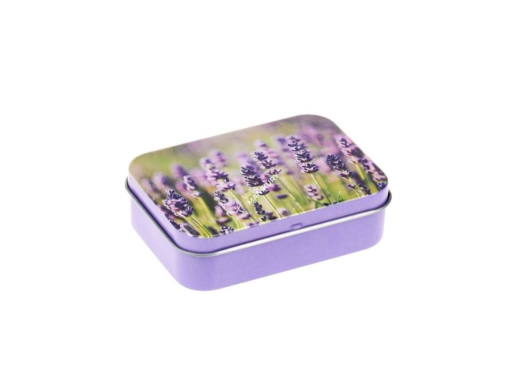 Marseillské levanduľové mydlo v plechovej krabičke s motívom francúzskeho Provensálska.