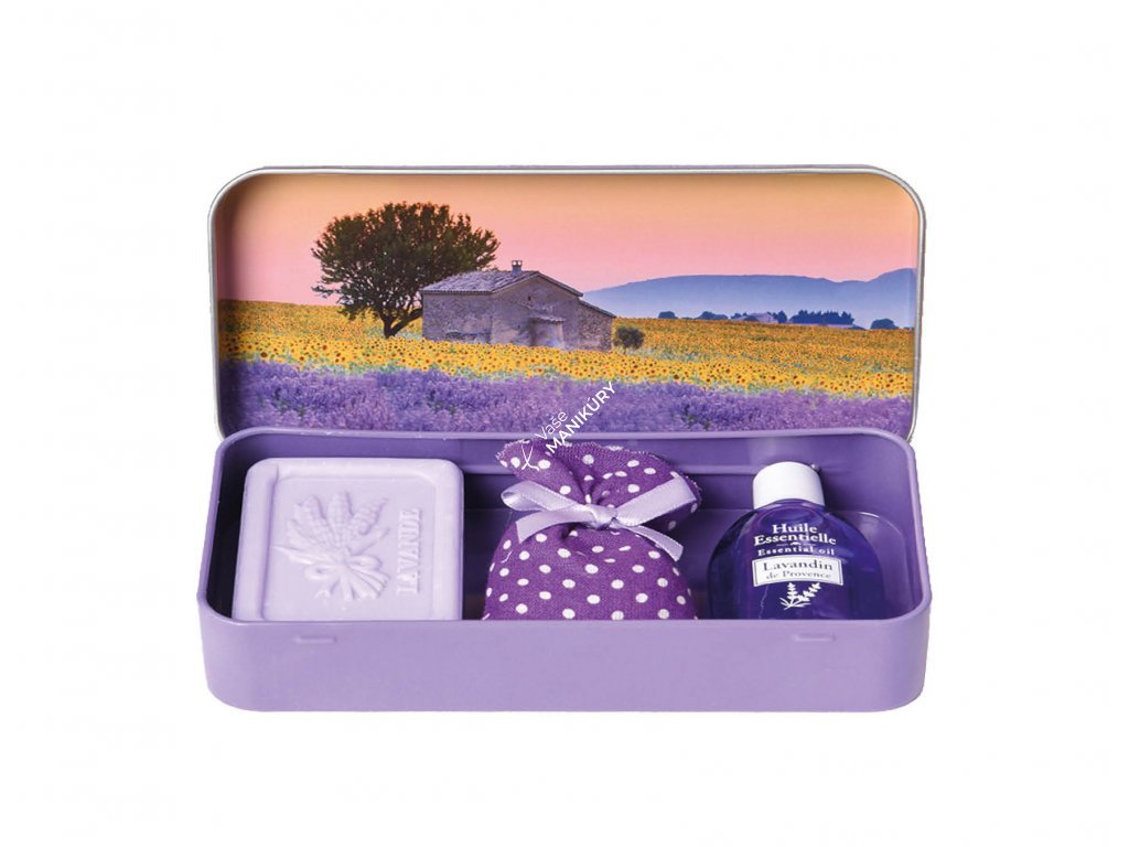 Set šetrne čistiaceho mydla, vonného vrecúška a esenciálneho oleja v praktickej plechovej krabičke s motívom provensálskej levandule.