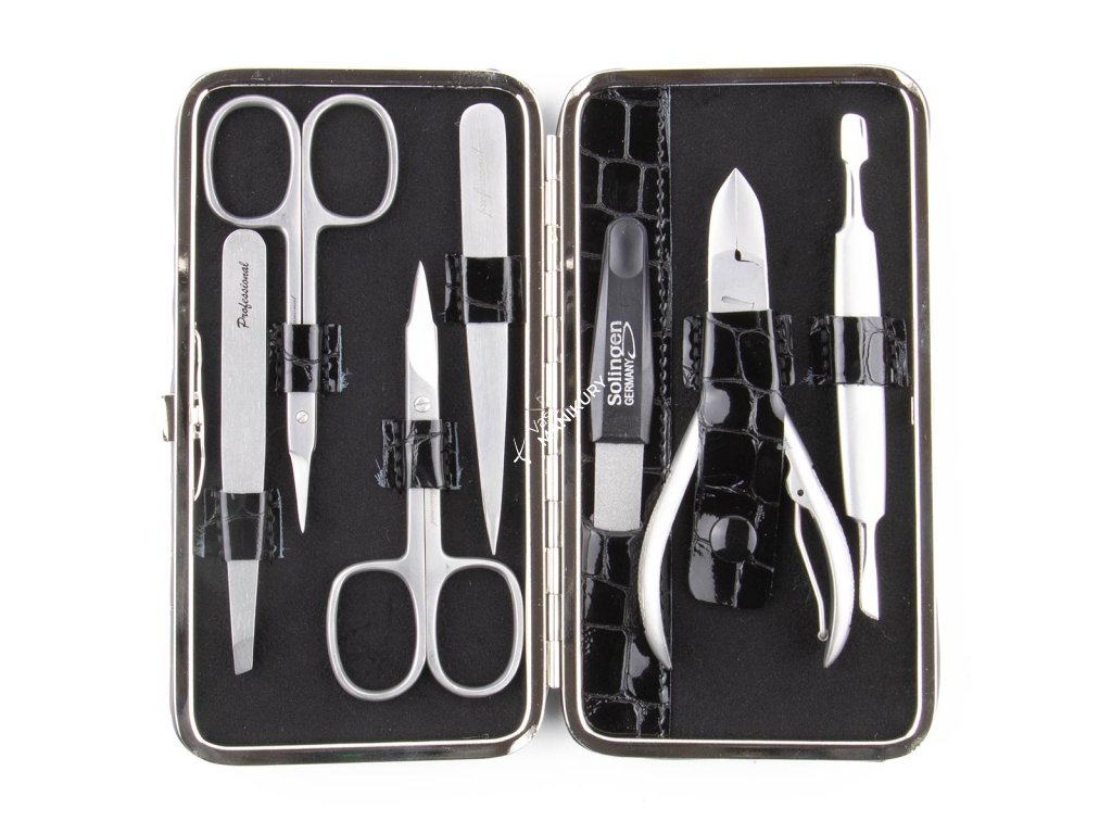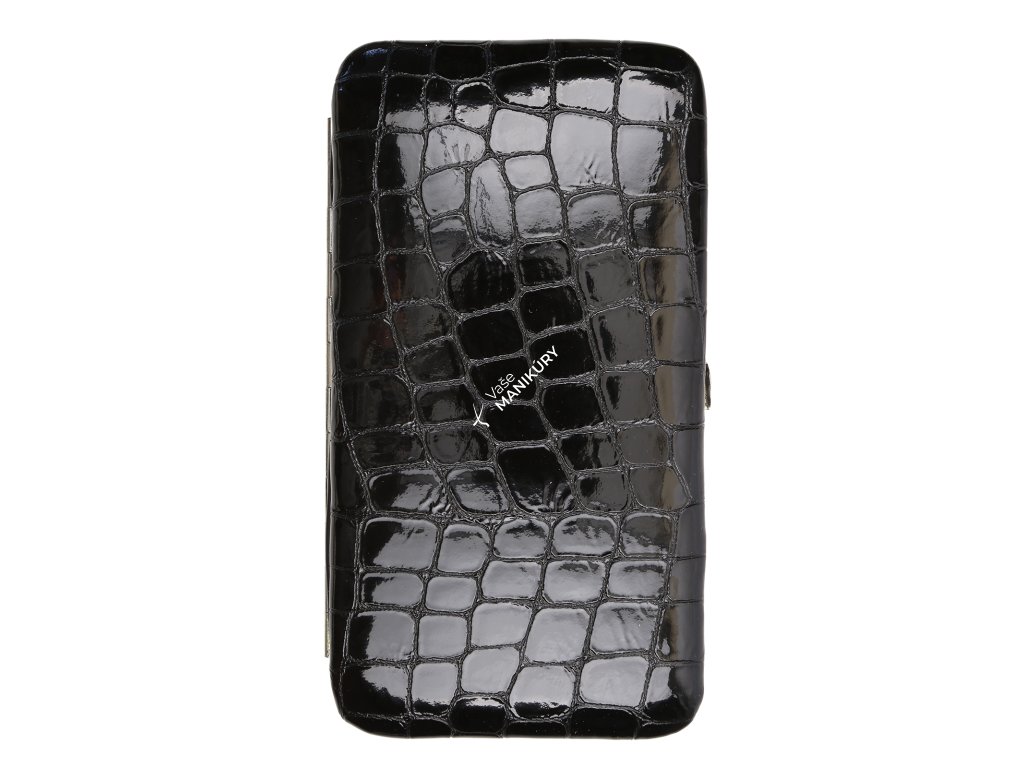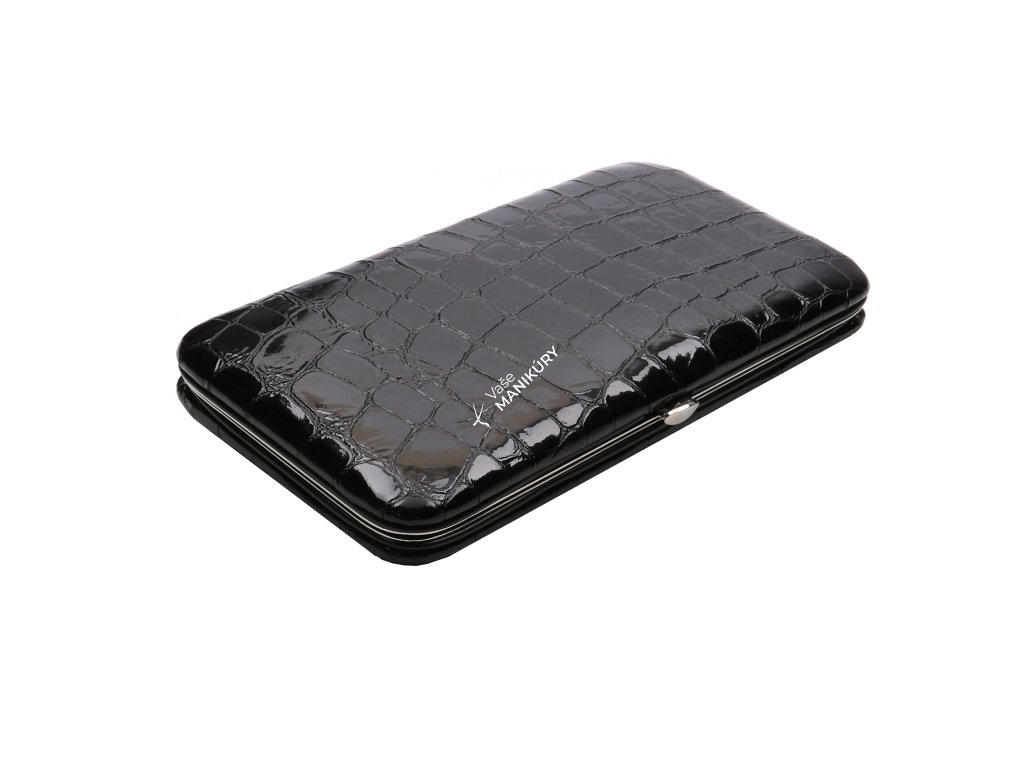 Krásna 7-dielna sada na manikúru s kvalitnými nerezovými nástrojmi v čiernom koženom puzdre so vzorom krokodíla.