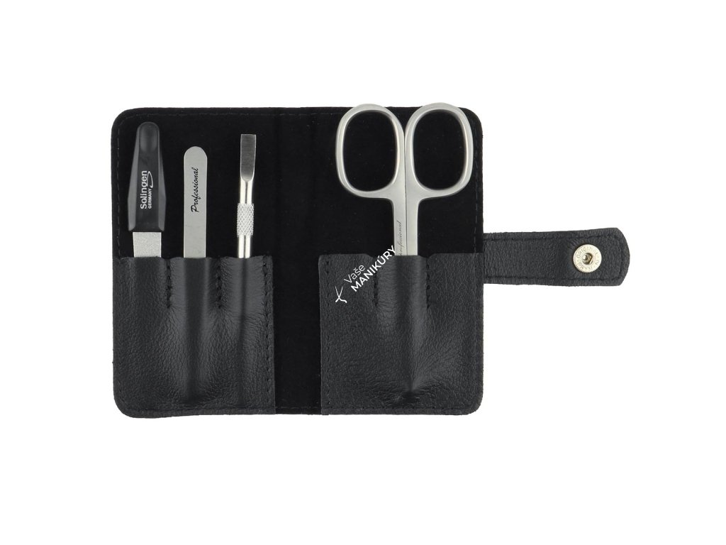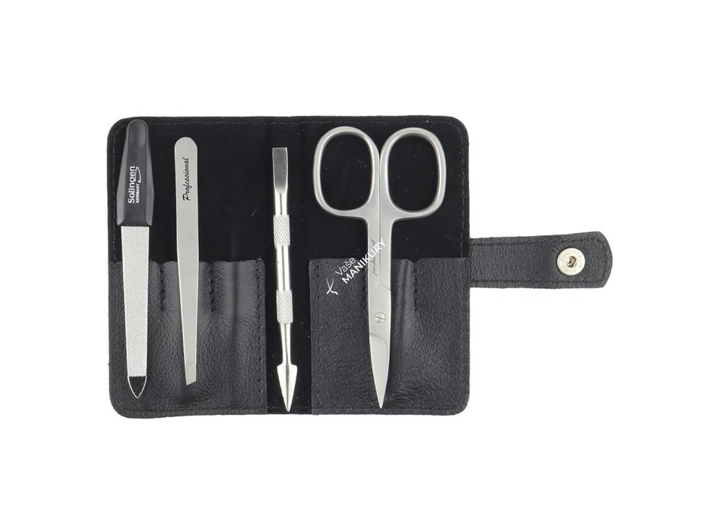 Praktická sada na manikúru, ktorá je svojou veľkosťou ideálna do kabelky či na cestovanie. V čiernom koženom puzdre nájdete 4 základné nástroje pre udržanie krásneho vzhľadu vašich rúk - nožničky a pilník Solingen, nerezovú pinzetu v matnej úprave a obojstranný nechtový nástroj na čistenie nechtov a zatlačovanie nechtovej kožtičky.