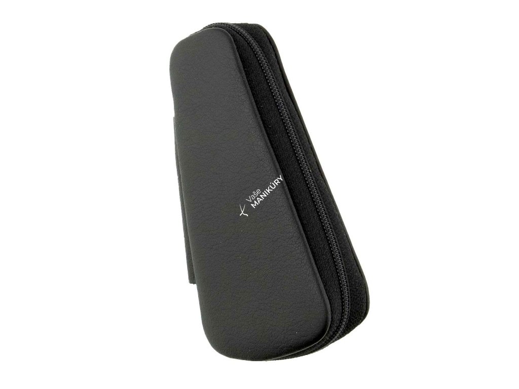 Pouzdro je vyrobeno z přírodní hovězí kůže v černé barvě. Uzavírá se na zip. Uvnitř má poutka na 4 manikúrní nástroje: nůžky na nehty, kleště na nehty, pilník, pinzetu, případně kleštičky/štipky.