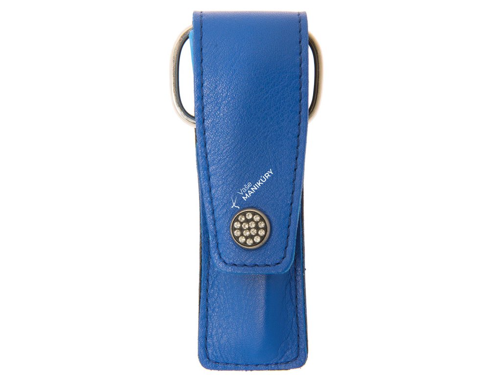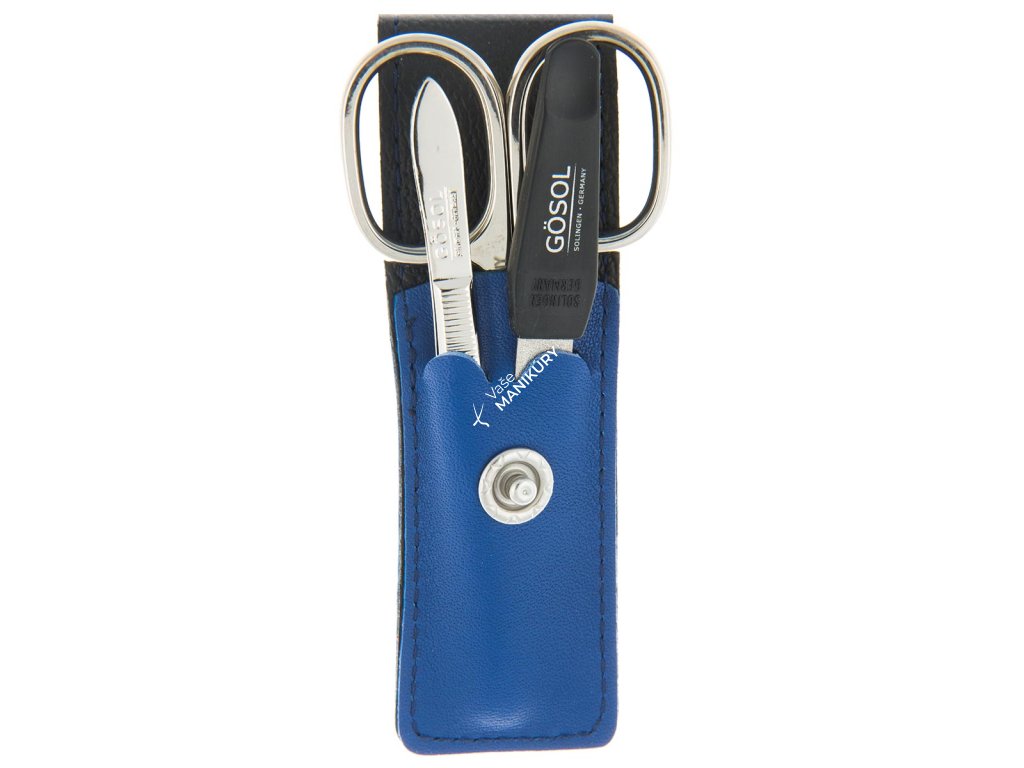 Puzdro so zatváraním na patent je vyrobené z jemnej prírodnej hovädzej kože v modrej farbe. Patent je ozdobený kamienkami a pôsobí ako výrazný okrasný prvok. Hladká pravá koža je atraktívna a príjemná na dotyk. Nájdete v ňom tri základné manikúrové nástroje z prvotriednej poniklovanej ocele od nemeckej značky GöSol Solingen, ktoré sú odolné voči opotrebovaniu. Vďaka tomu, že sú vyrobené z vysoko kvalitnej ocele, zostávajú neuveriteľne dlho ostré.