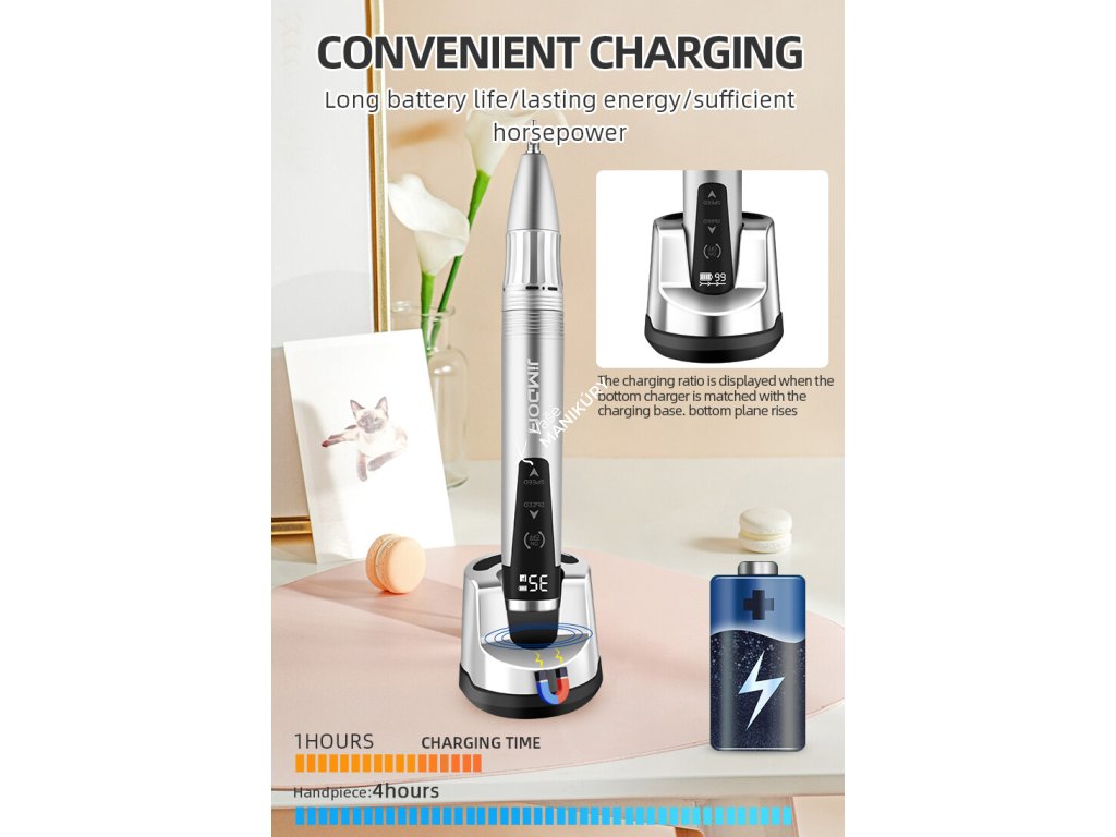 Príjemná, ergonomicky tvarovaná brúska JMD-109S s dobíjacou základňou. Brúska sa jednoducho ovláda aj používa a poskytuje pri práci potrebný komfort zjednodušujúci jej pravidelné používanie. Najvyššia dosiahnuteľná rýchlosť je 35tis ot./min. Optimálny príkon magnetickej základne pre nabíjanie je 15W. Brúska je navrhnutá pre pravidelný prevoz s cieľom dosiahnuť vysoký výkon pri klasických operáciách spojených so starostlivosťou o nechty, ako brúsenie či leštenie.