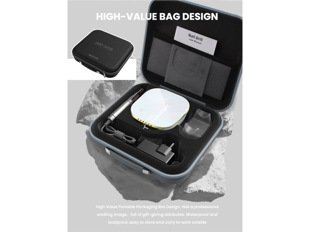 Bezkartáčová brúska na nechty JIMDOA model JMD-S108 je moderné zariadenie na úpravu a narovnávanie nechtov (prírodných aj umelých) na rukách a nohách. Brúska sa skladá z ovládacieho panela, ktorý je zároveň nabíjacou stanicou , a brúsneho nadstavca s rukoväťou. Mlynček je k dispozícii v niekoľkých atraktívnych farebných variantoch. Bezkartáčová brúska má bezuhlíkový motor. Má vyšší výkon, nižšiu spotrebu, menej tepla a umožňuje vyššie rýchlosti. Tým sa eliminuje iskrenie a nadmerná produkcia tepla a znižuje sa opotrebovanie uhlíkových kief. Vydrží väčšie pracovné zaťaženie pri dlhých hodinách profesionálnej práce.