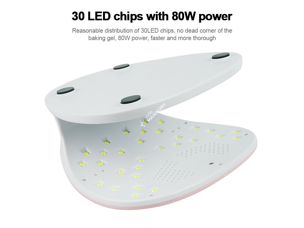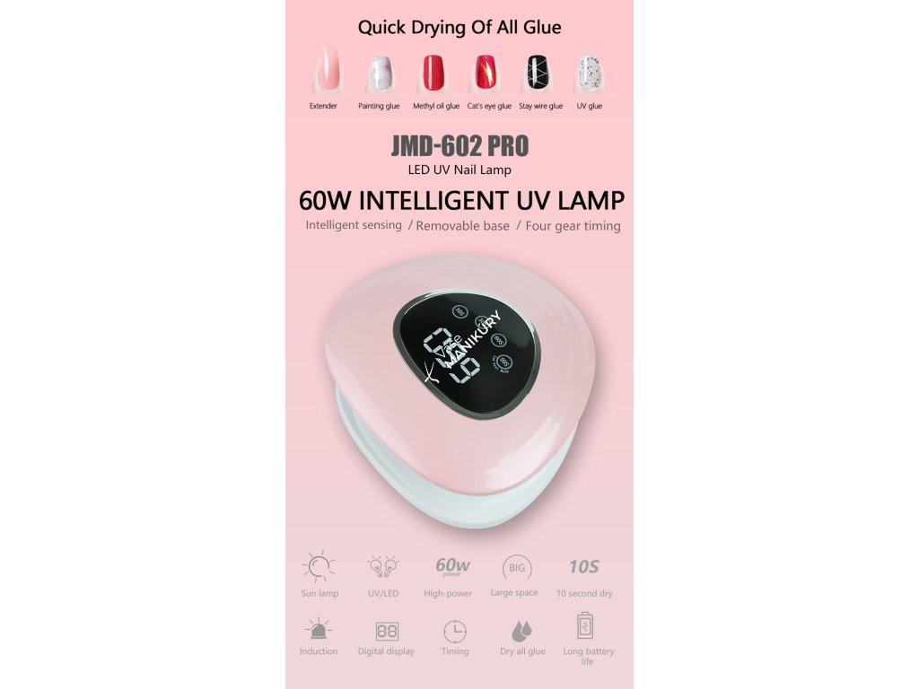 LED UV lampa JMD -602 PRO je určena pro vytvrzování umělých nehtů, které vyžadují působení ultrafialového záření ( gel laky, UV gely, gelové barvy, lepidlo na drahokamy, ...). Je navržena s větším prostorem pro obě ruce nebo nohy najednou bez obav z rozmazání laku. Lampa je vybavena 30 LED diodami, které jsou umístěny po celé ploše, což umožňuje rovnoměrné vytvrzování v celé pracovní oblasti. Velký LCD display zobrazující dobu vytvrzování zaručuje, že budete dělat nail art bezpečně, pohodlně a profesionálně v salonu ale i doma.