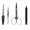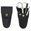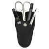 Praktické puzdro na manikúru so zatváraním na patent je vyrobené z prírodnej hovädzej kože v čiernej farbe s hladkou povrchovou úpravou. Puzdro je vybavené nástrojmi z kvalitnej poniklovanej ocele od nemeckého výrobcu Kellermann a nájdete v ňom tie najdôležitejšie nástroje pre vaše krásne nechty - nožnice na nechty, zafírový pilník, pinzetu i plastový nástroj na čistenie nechtov a zatláčanie nechtovej kožtičky.