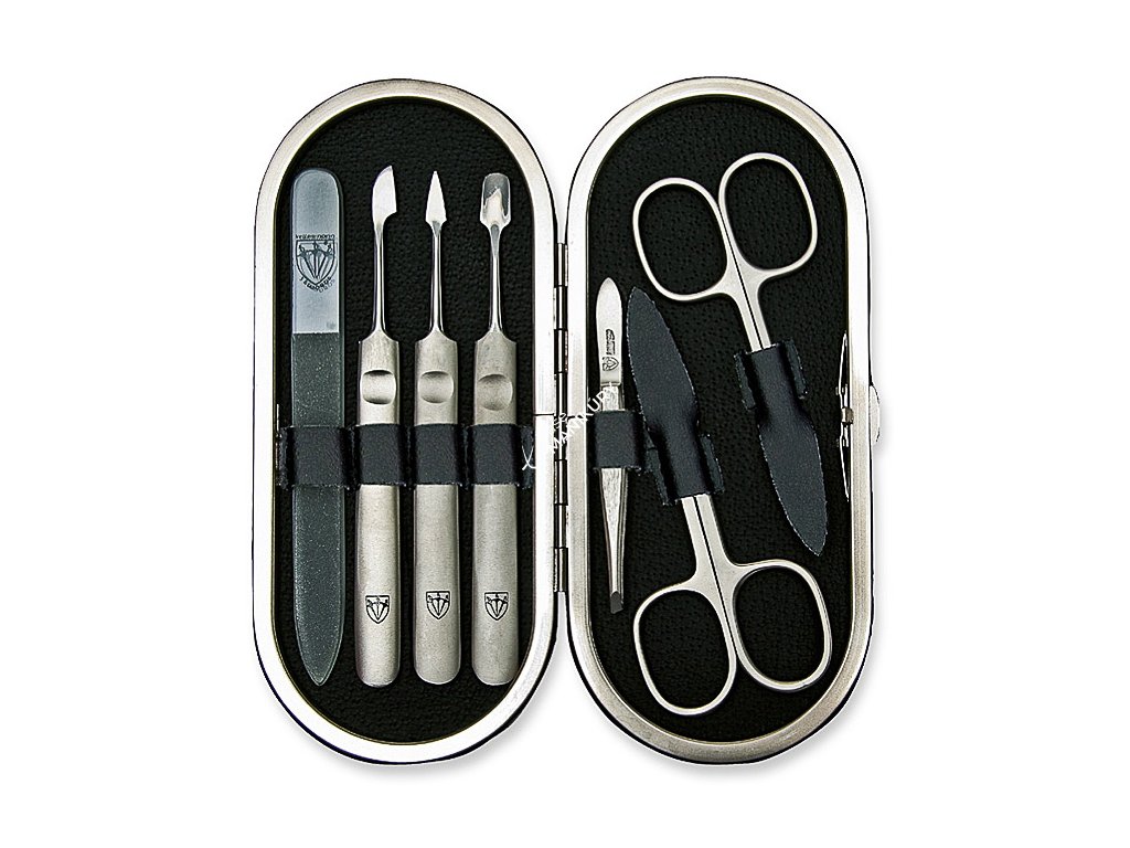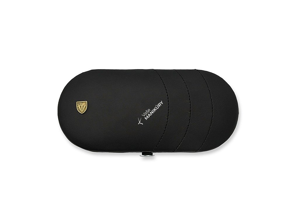 Krásna dámska sada na manikúru pre ženy. Čierne puzdro je vyrobené z jemnej prírodnej hovädzej kože s pevným kovovým rámom. Látka na vnútornej strane púzdra je na povrchu zamatová, jemná a veľmi príjemná na dotyk. puzdro obsahuje sedem oceľových nástrojov prvotriednej kvality v matnej úprave od nemeckého výrobcu manikúra Kellermann, ktoré sú veľmi odolné proti opotrebeniu.
