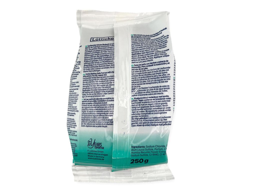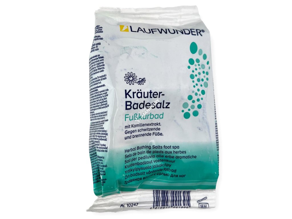 Bylinná soľ do kúpeľa Laufwunder je prísada do kúpeľa na nohy, ktorá jemne a účinne čistí pokožku a nechty pomocou rozpustených kryštálikov soli. Výživné výťažky z harmančeka vitalizujú vaše nohy a dodávajú im silu. Má osviežujúci a povzbudzujúci účinok na pokožku prepracovaných, unavených nôh a nôh s pocitom pálenia. Pri pravidelnom používaní sa zmierňuje nadmerné potenie a zápach nôh. Zmäkčuje rohovú vrstvu pokožky - mozoľ a otlaky sa následne ľahšie odstraňujú.