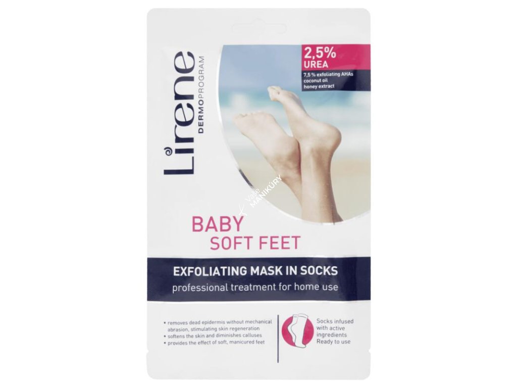 Exfoliačná maska na nohy LIRENE v ponožkách odstraňuje odumreté bunky bez mechanického trenia, regeneruje a zjemňuje pokožku. Minimalizuje stvrdnutú kožu a zanecháva nohy jemné a mäkké. Obsahuje 2,5% urey, 7,5% kyseliny AHA, kokosový olej a medový extrakt.