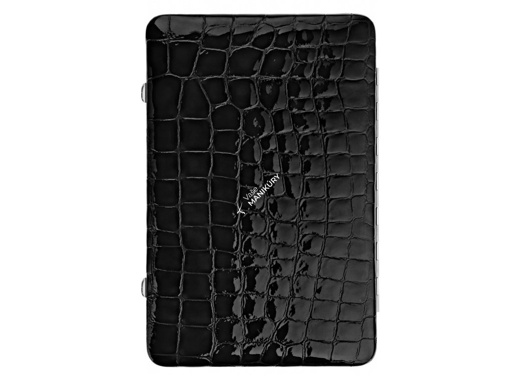Kolekcia elegantných dámskych manikúr Kroko má nadčasový vzhľad s nádychom luxusu. Puzdro manikúry Kroko v čiernej farbe je vyrobené z najkvalitnejšej talianskej teľacej kože a kombinuje jedinečný krokodílí vzor s lesklým povrchom. Na vnútornej strane puzdra je zamatovo jemná látka. Dvojdielne puzdro sa jednoducho otvára. Rám je z lesklej pochromovanej ocele.