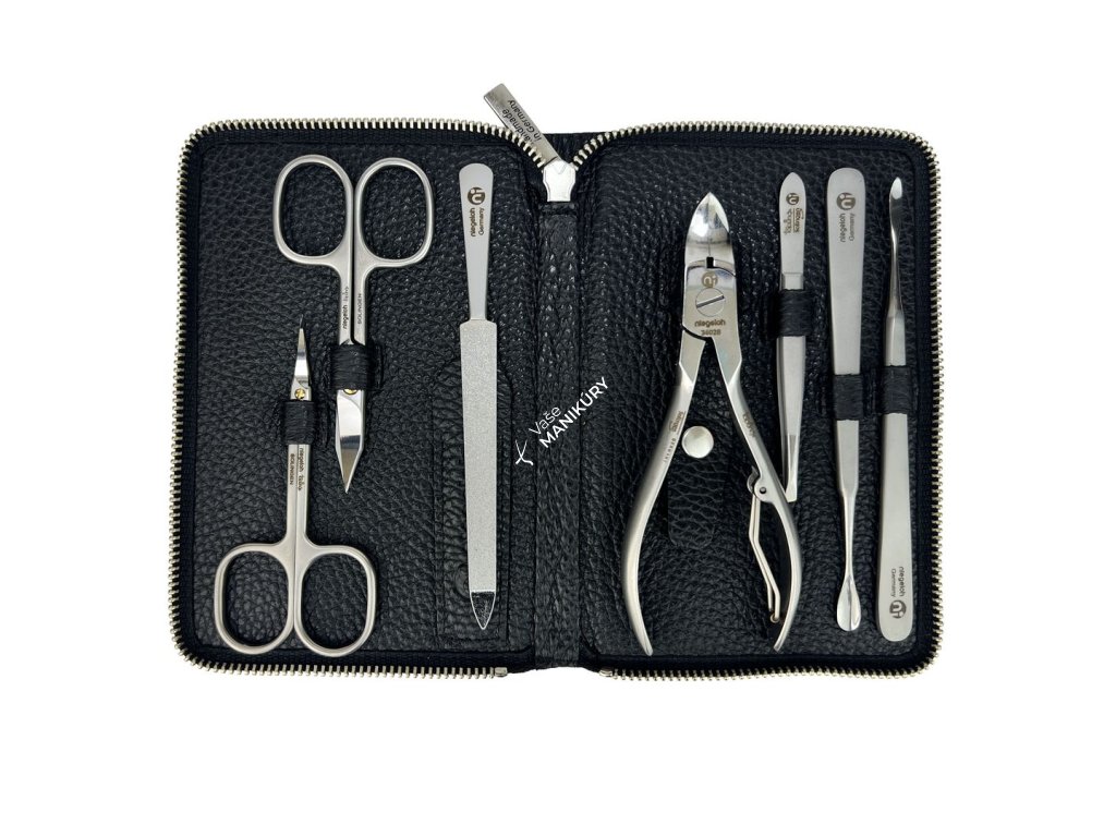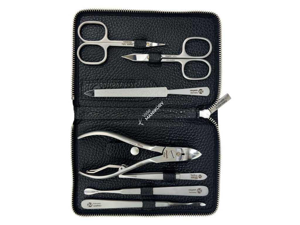 Kolekcia luxusných manikúr Niegeloh je určená všetkým, ktorí od svojej manikúrnej sady očakávajú len tú najvyššiu kvalitu. Táto veľmi dobre vybavená sada kombinuje luxus mäkkého čierneho koženého puzdra s praktickosťou pohodlného zapínania na zips. Puzdro je vyrobené z prírodnej hovädzej kože, ktorá je mimoriadne jemná a príjemná na dotyk. Aj vnútorná strana je zhotovená z prvotriednej pravej kože.