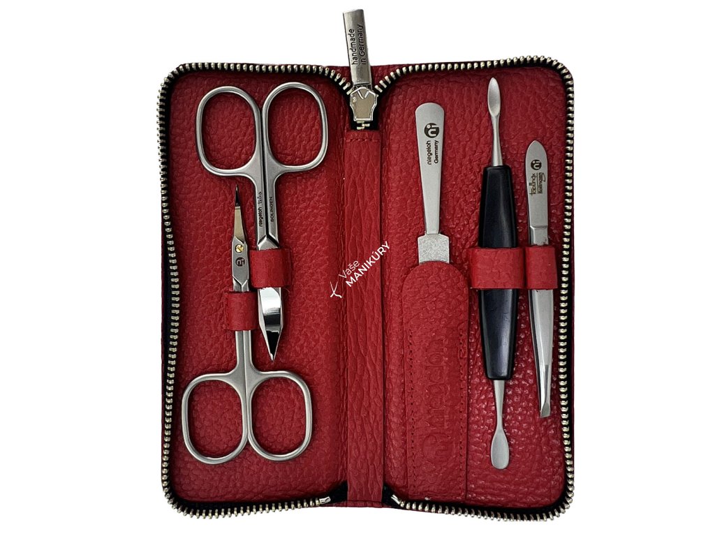 Kolekcia luxusných manikúr Niegeloh je určená všetkým, ktorí od svojej manikúrnej sady očakávajú len tú najvyššiu kvalitu. Táto manikúrna sada kombinuje luxus mäkkého červeného koženého puzdra s praktickosťou pohodlného zapínania na zips. Puzdro je vyrobené z prírodnej hovädzej kože, ktorá je jemná a príjemná na dotyk. Aj vnútorná strana je zhotovená z prvotriednej pravej kože.