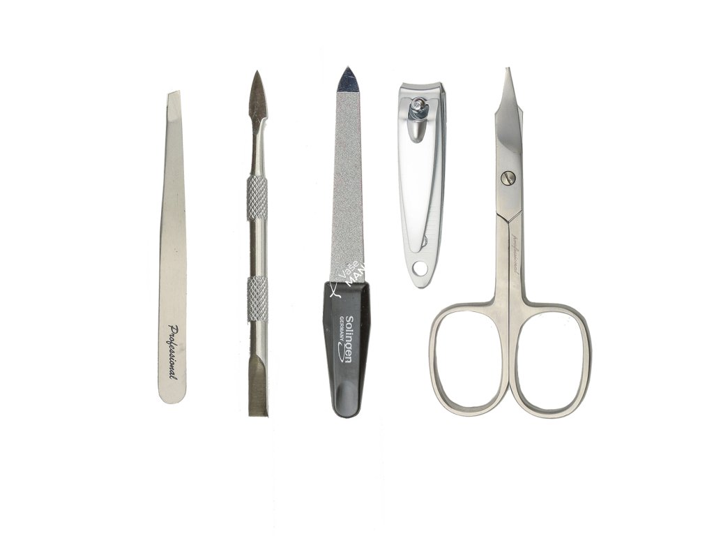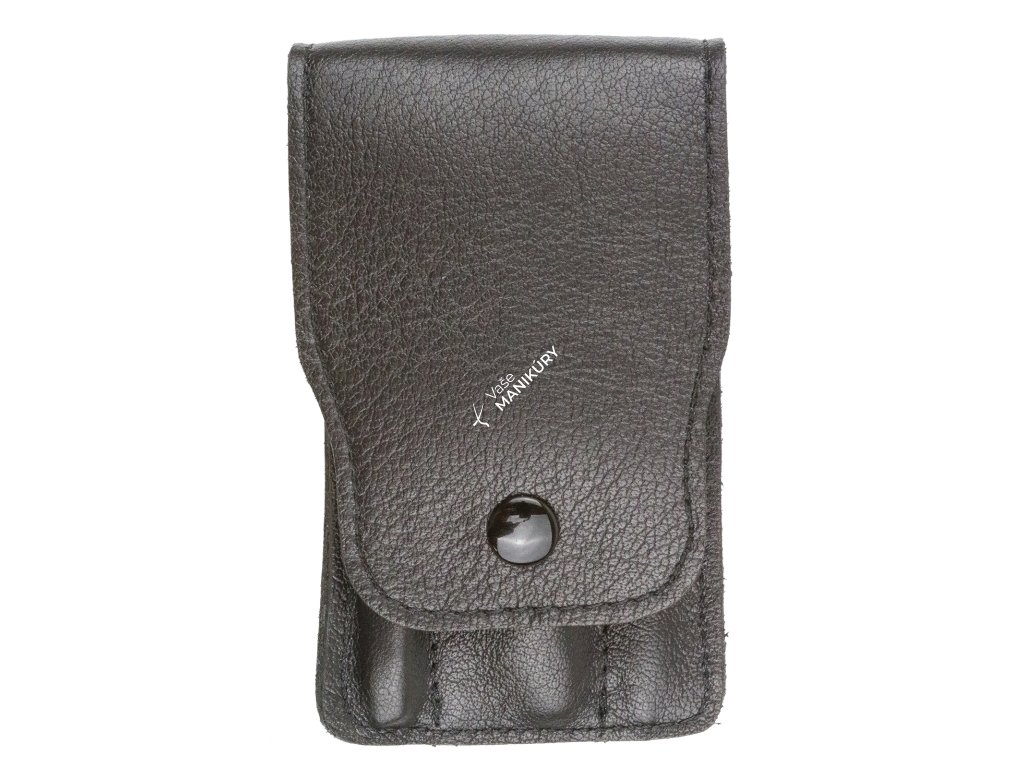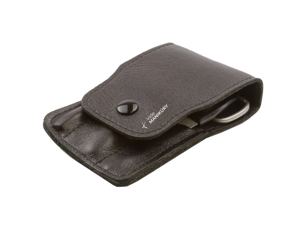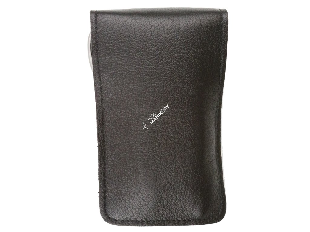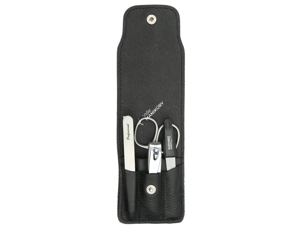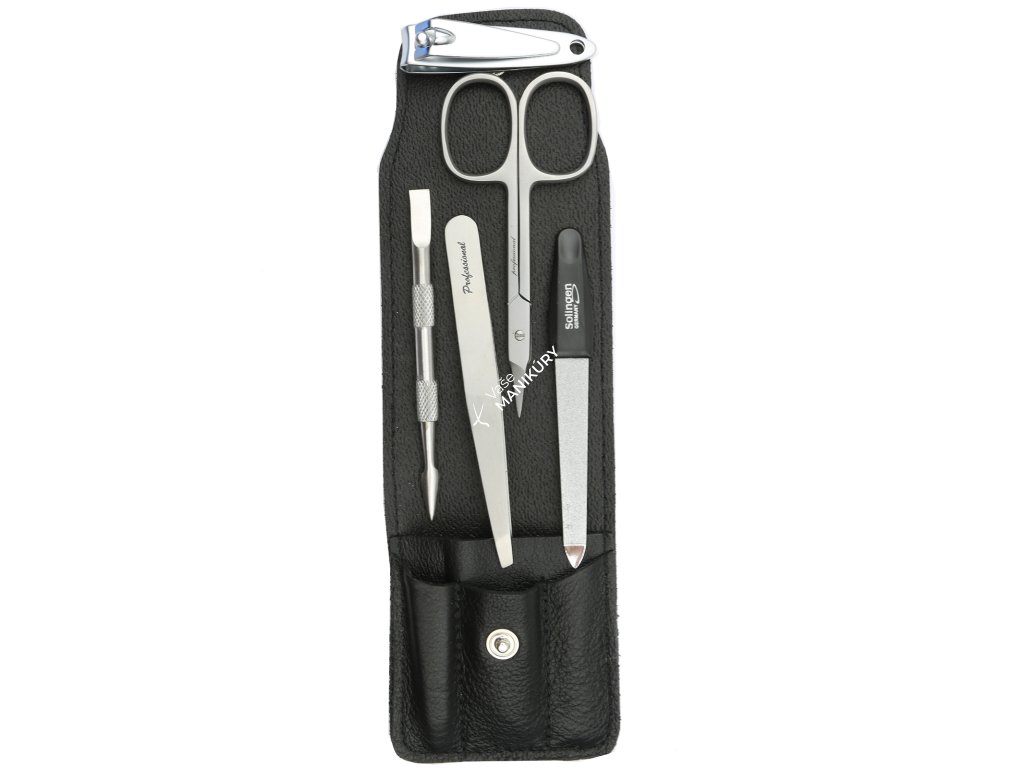 Štýlové čierne puzdro na manikúru so zapínaním na patent je vyrobené z hovädzej kože. Manikúra je vybavená nerezovými nástrojmi v matnej úprave rady Professional a zafírovým pilníkom Solingen.