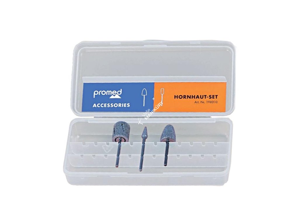 Sada fréz Promed na odstránenie silne zrohovatenej kože, otlakov a na odstránenie kožtičky. Bity sú vhodné na profesionálne a domáce použitie. Nástavce majú štandardný priemer 2,32mm-2,35mm, takže sa hodia na väčšinu moderných brúsok na nechty.