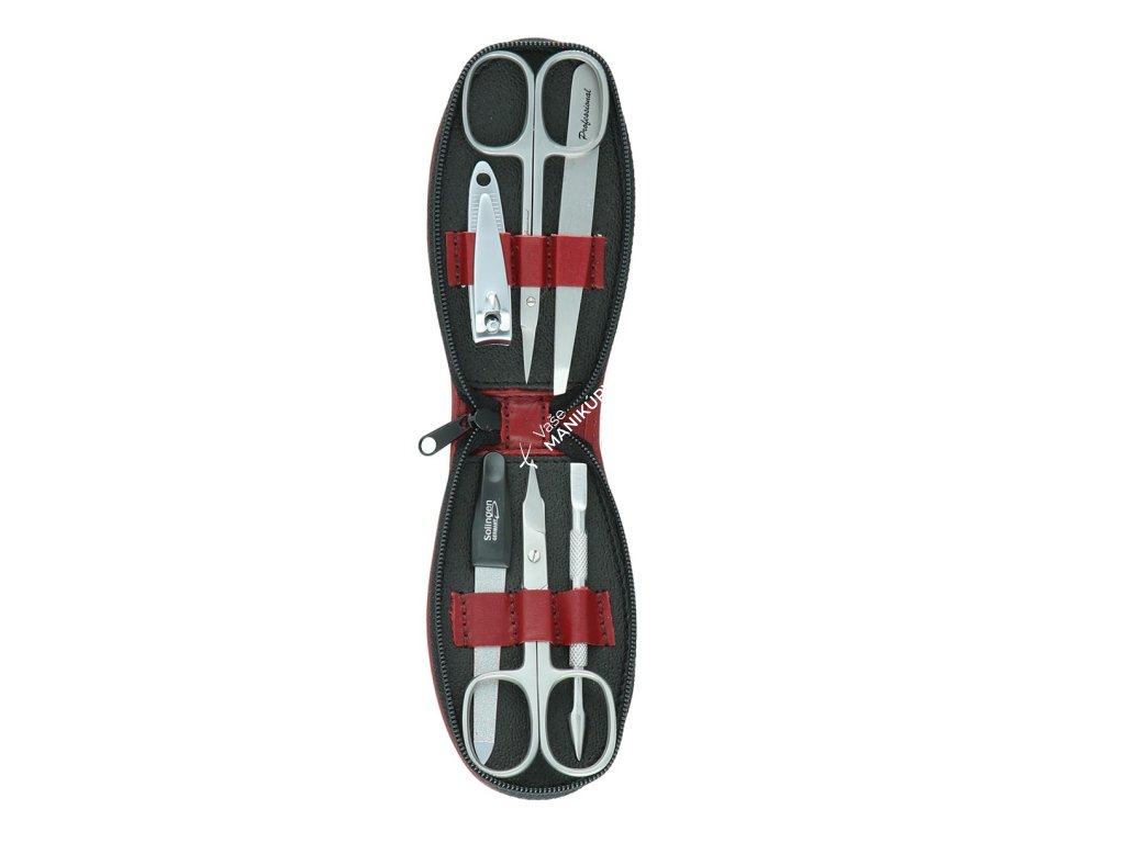 Táto krásna sada na manikúru z prírodnej hovädzej kože vo vínovej farbe vás zaujme predovšetkým svojou veľkosťou a napriek tomu v nej nájdete všetko, čo potrebujete pre starostlivosť o vaše ruky. Praktická veľkosť sady sa hodí aj na cesty a nemusíte sa obávať, že niektorý diel tejto sady stratíte. Všetky nástroje sú prehľadne uložené v koženom farebnom puzdre uzatvárateľnom na zips. Nástroje sú vyrobené z kvalitnej nehrdzavejúcej ocele v matnej úprave nemeckou firmou Solingen. Výrobky značky Solingen sú známe svojim špičkovým spracovaním a dlhou životnosťou.