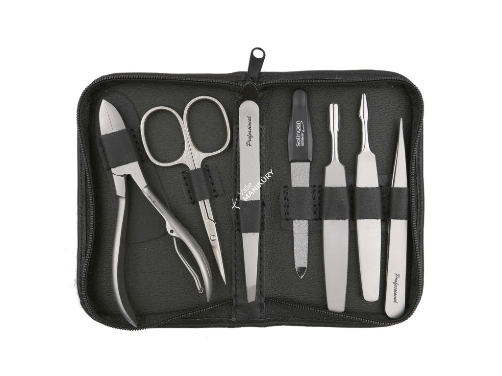 Puzdro je vyrobené z kvalitnej hovädzej kože v čiernej farbe a je uzatvárateľné na zips. Vnútri nájdete nožnice a pilník Solingen. Ostatné nástroje sú z nerezovej ocele v matnej úprave rady Professionall. Výrobky Solingen aj nerezové nástroje sú preslávené dlhou životnosťou.