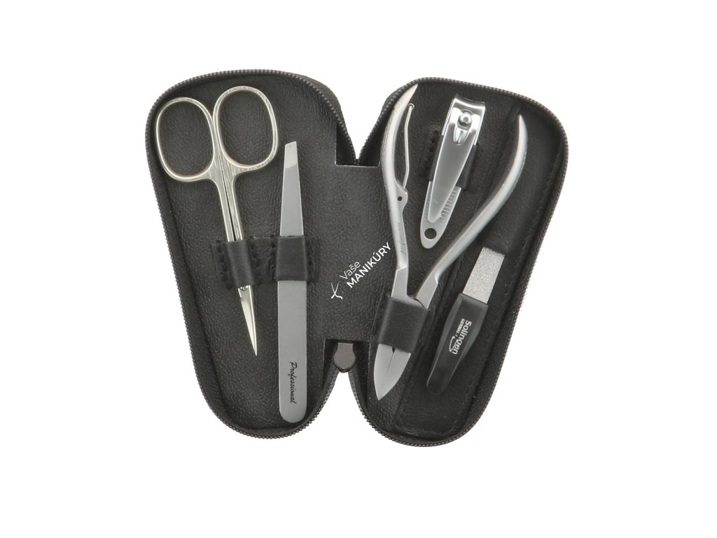 - Pánska sada na manikúru v koženom puzdre - Obsahuje nožnice na kožtičku, kliešte na nechty, zafírový pilník, šikmú pinzetu a malé klieštiky na nechty. Všetky nástroje sú vyrobené z nerezovej ocele a sú uložené v elegantnom čiernom puzdre z prírodnej hovädzej kože, ktoré sa uzatvára na zips. Ideálny na cesty a ako skvelý darček.