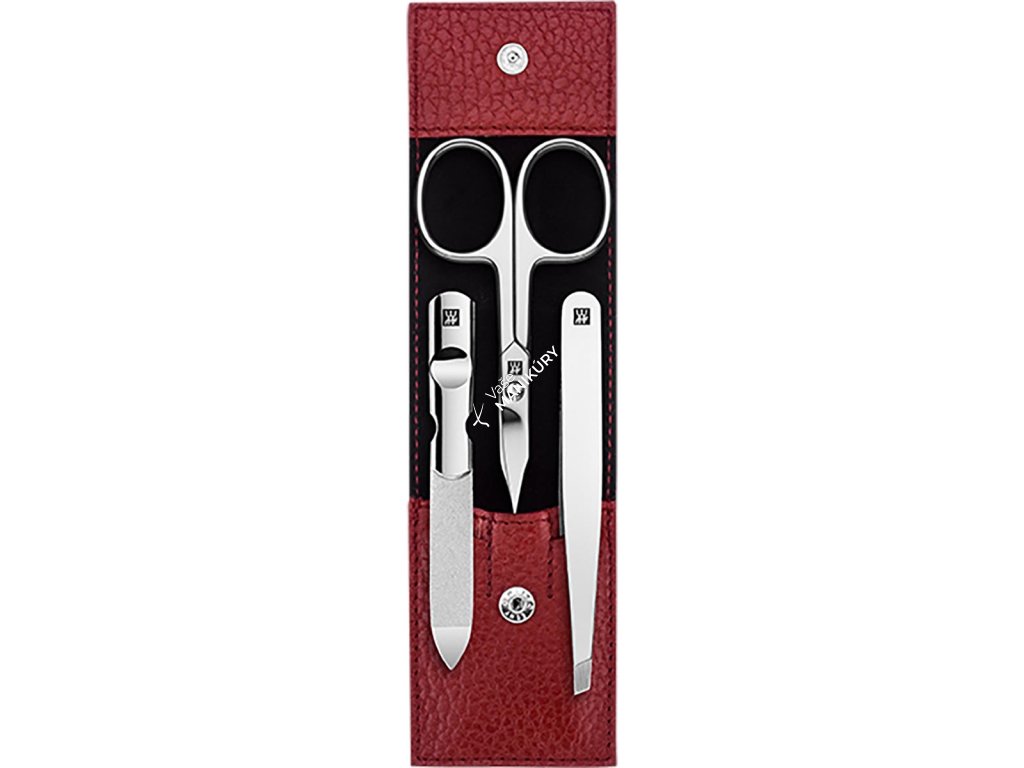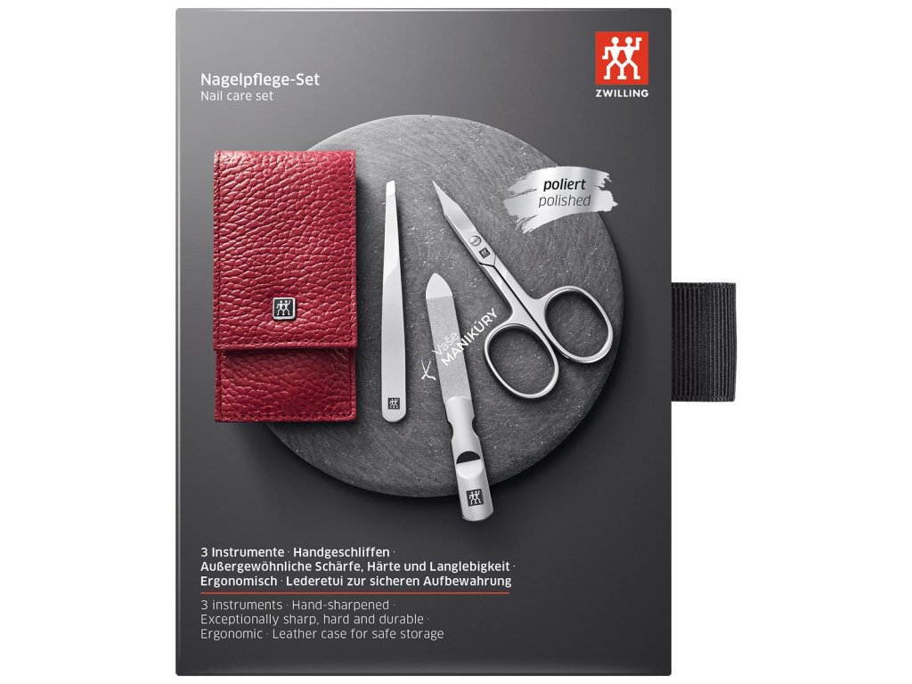 Praktická 3-dielna sada ZWILLING s nástrojmi z poniklovanej leštenej nehrdzavejúcej ocele v atraktívnom červenom koženom puzdre.