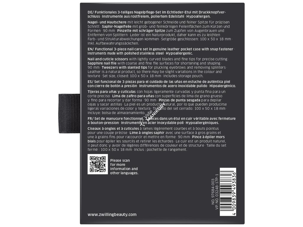 Trojdielna manikúrová sada z kolekcie Premium od nemeckej značky ZWILLING spája špičkovú kvalitu, luxusný dizajn a praktickosť. Elegantná sada obsahuje tri najčastejšie používané nástroje na starostlivosť o nechty a kutikuly, a je ideálna na každodenné použitie. Kompaktné prevedenie puzdra umožňuje bezpečné uloženie manikúrových nástrojov doma aj na cestách.