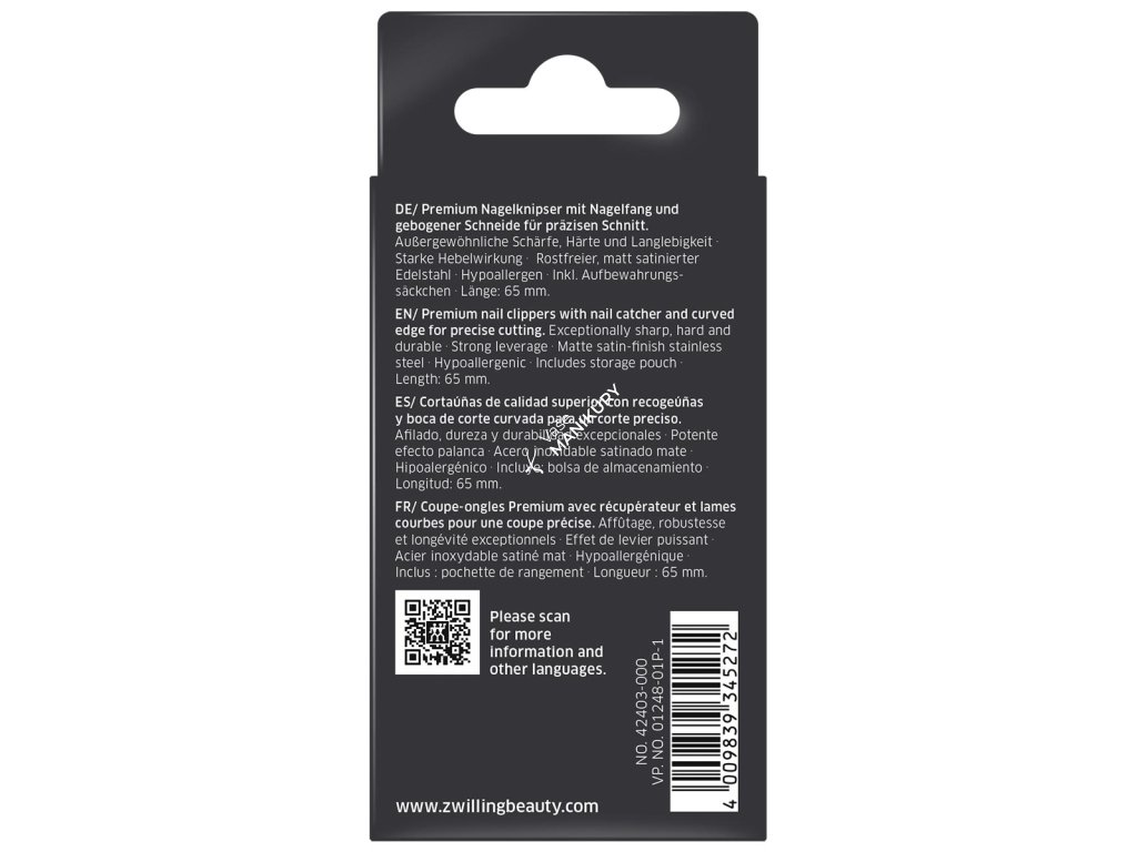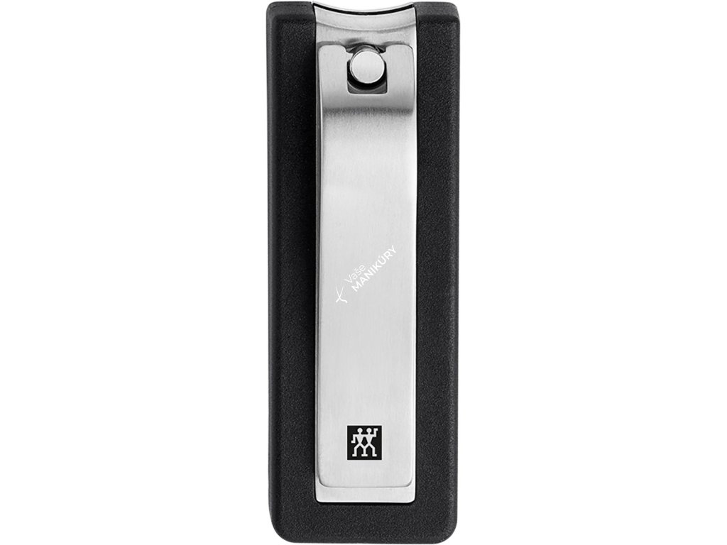 Prémiové klieštiky na nechty Zwilling s čiernym lapačom nechtov a mierne zahnutou čepeľou na presné strihanie.