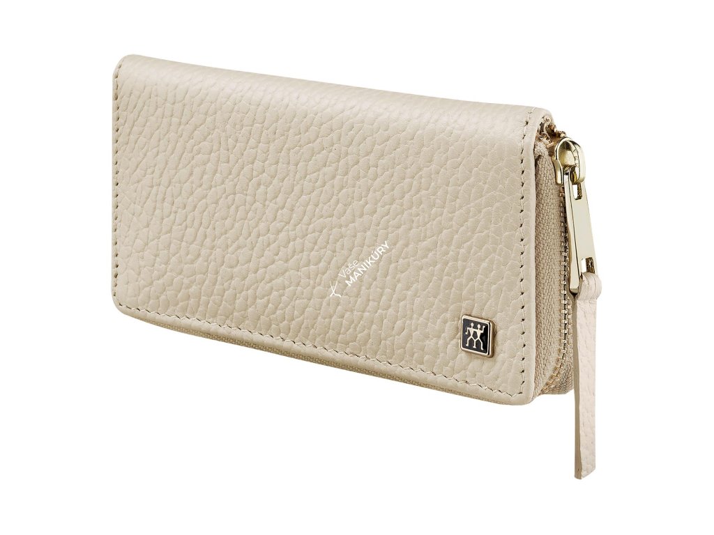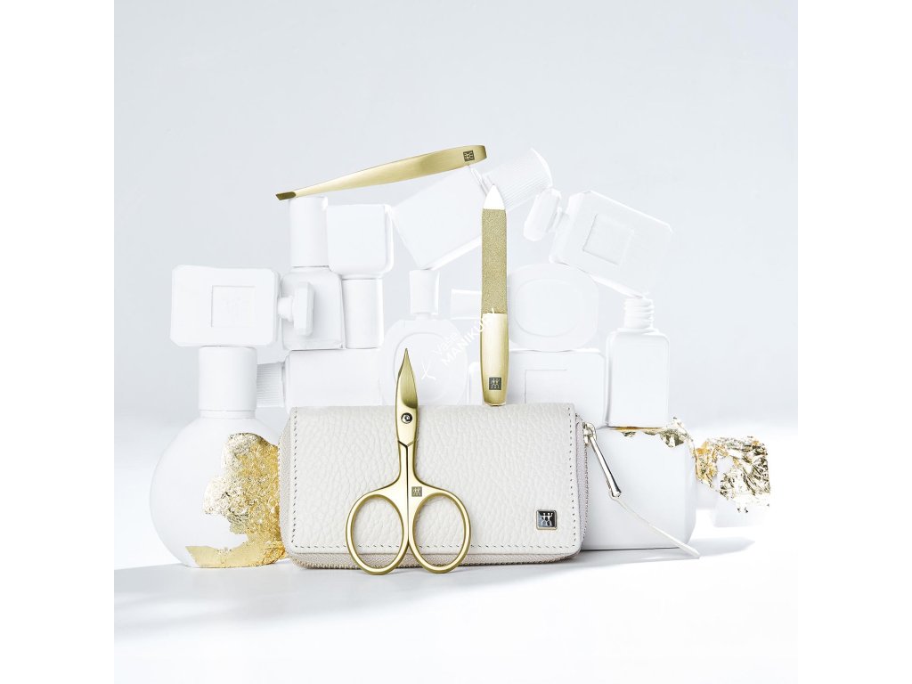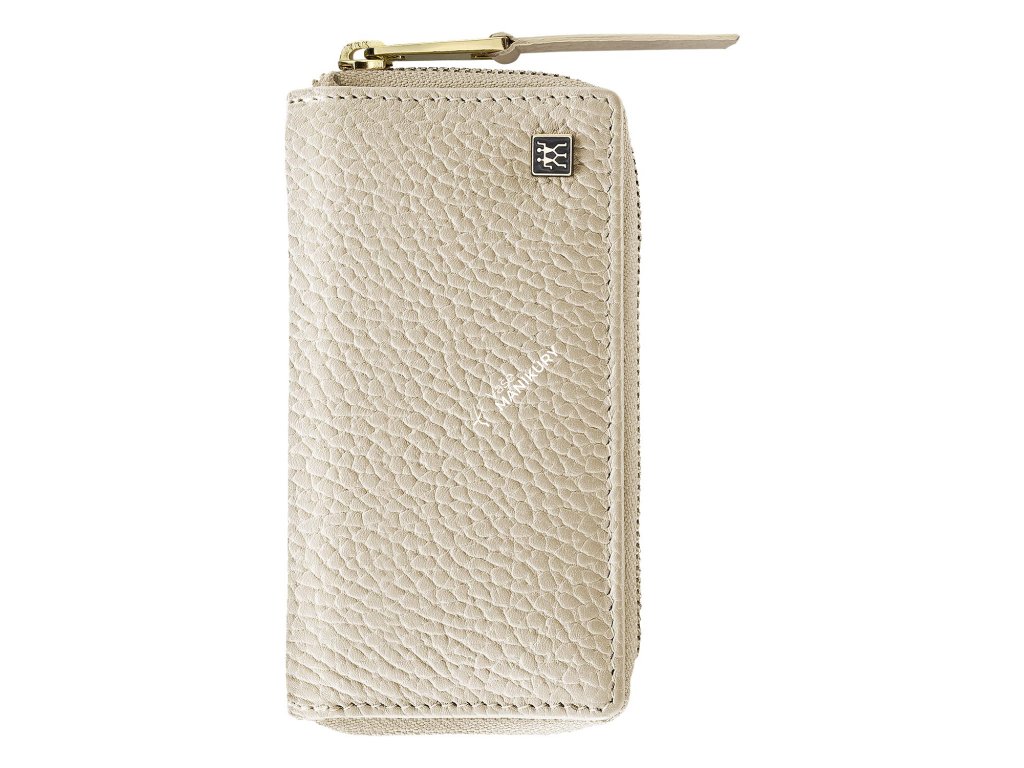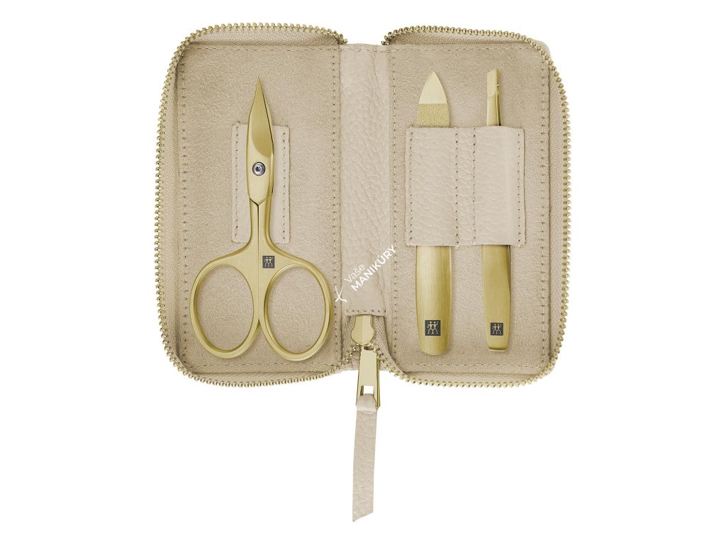 Manikúrové nástroje sú uložené v modernom puzdre z jemnej hovädzej kože vo svetlobéžovej farbe, doplnenom výrazným zlatým zipsom ladiacim s farbou nástrojov.