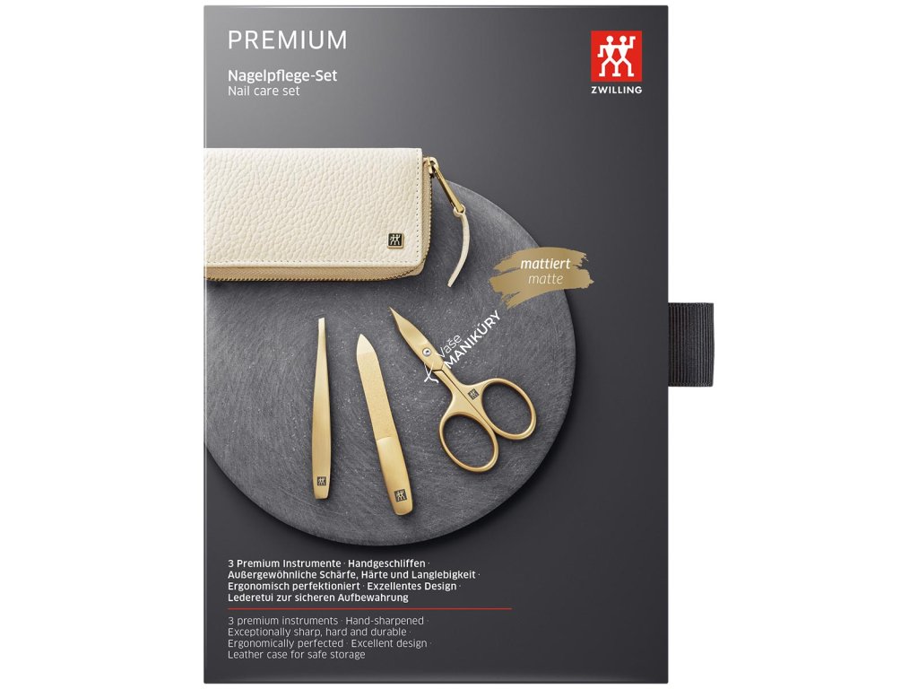 Luxusná kožená trojdielna súprava s nerezovými nástrojmi s pozláteným povrchom nemeckej značky ZWILLING PREMIUM.