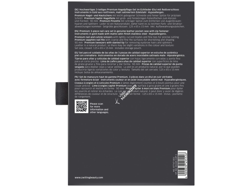 Trojdielna manikúrna súprava Premium Gold od nemeckej značky ZWILLING Beauty spája špičkovú kvalitu, luxusný dizajn a praktickosť. Elegantná súprava obsahuje tri najčastejšie používané nástroje na starostlivosť o nechty a kožičku a je ideálna na každodenné použitie. Kompaktné prevedenie puzdra umožňuje bezpečné uloženie manikúrnych nástrojov doma aj na cestách.