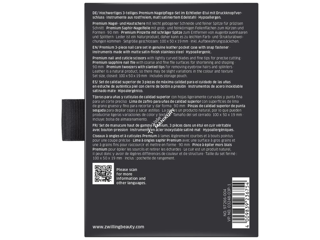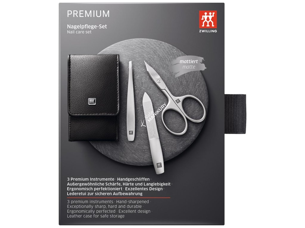 Trojdielna manikúrová súprava z kolekcie Premium od nemeckej značky ZWILLING spája špičkovú kvalitu, luxusný dizajn a praktickosť. Elegantná súprava obsahuje tri najčastejšie používané nástroje na starostlivosť o nechty a je ideálna na každodenné použitie. Táto manikúra je veľmi praktická pri cestovaní. Vďaka menším rozmerom sa pohodlne zmestí do každej batožiny či kozmetickej taštičky.