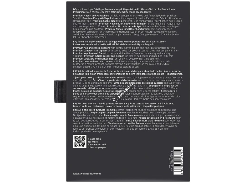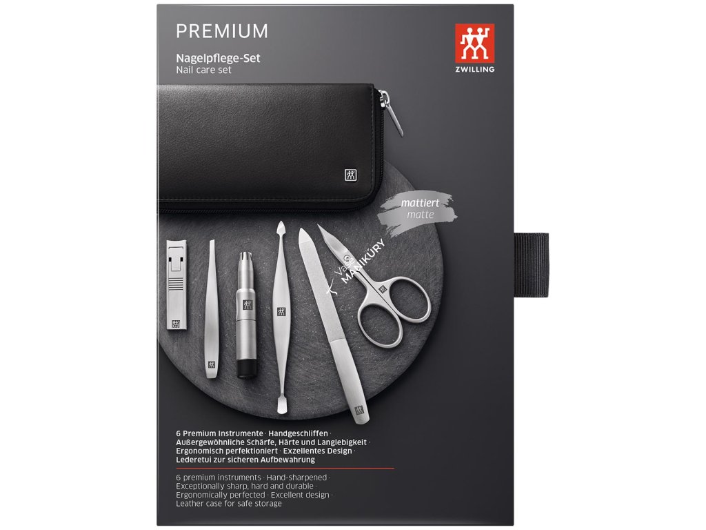 Luxusná pánska 6-dielna sada na manikúru a pedikúru prémiovej kvality z kolekcie PREMIUM TWINOX® od nemeckej značky ZWILLING Beauty obsahuje najdôležitejšie nástroje pre kompletnú starostlivosť o nechty. Súčasťou sady je aj nástroj na presné a bezpečné odstraňovanie chĺpkov z nosa a uší. Táto manikúrna sada v elegantnej čiernej farbe je skvelou voľbou pre každého, kto si potrpí na pohodlie, štýl a špičkovú kvalitu v starostlivosti o nechty.